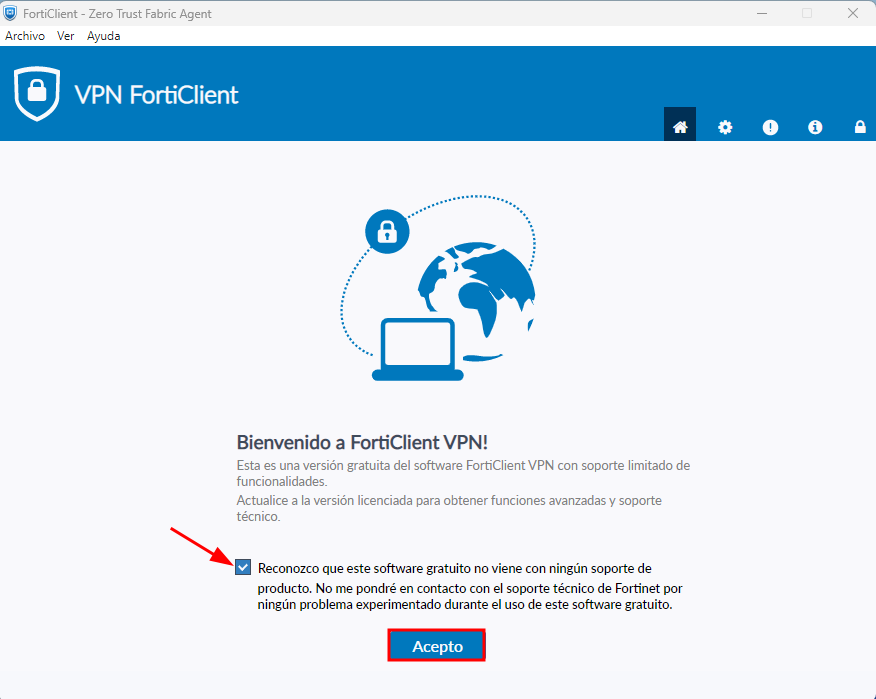 2. Finalizada la instalación ejecuta la aplicación Forticlient VPN y acepa los términos y condiciones de uso de la aplicación presionando el botón Acepto.