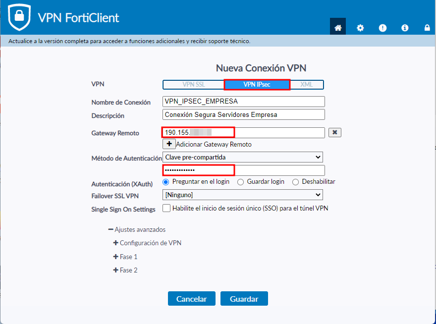 • En la sección Gateway Remoto especifica la dirección IP Pública asociada a la interfaz WAN del equipo Fortigate.