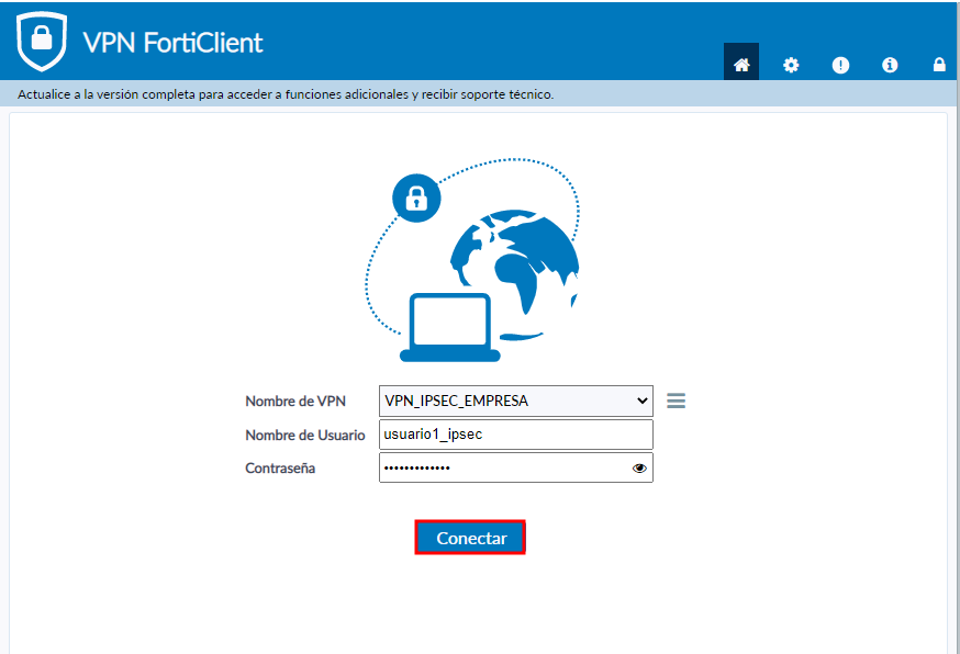 1. A continuación se desplegará la interfaz para ingresar el usuario y la respectiva contraseña. Para este ejemplo emplearemos el usuario usuario1_ipsec. Ingresamos la contraseña y presionamos clic en el botón Conectar.