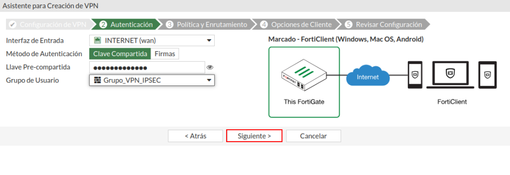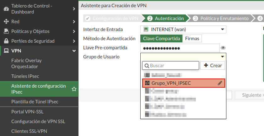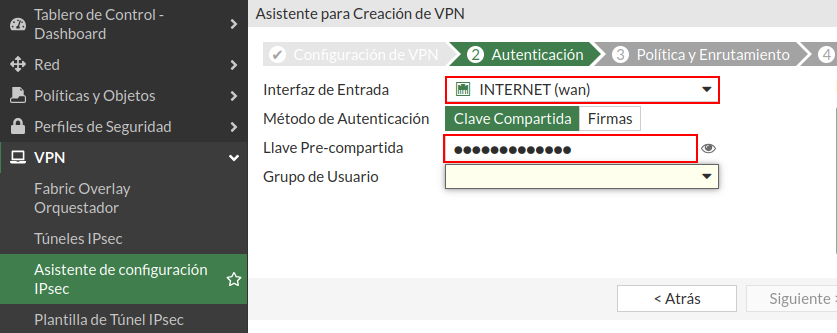 3. En la opción Llave Pre-compartida especifica la contraseña que empleará el cliente de la VPN (Forticlient) para establecer conexión. Recuerda especificar una contraseña fuerte con un longitud de al menos 12 caracteres que incluya letras mayúsculas, números y caracteres especiales.