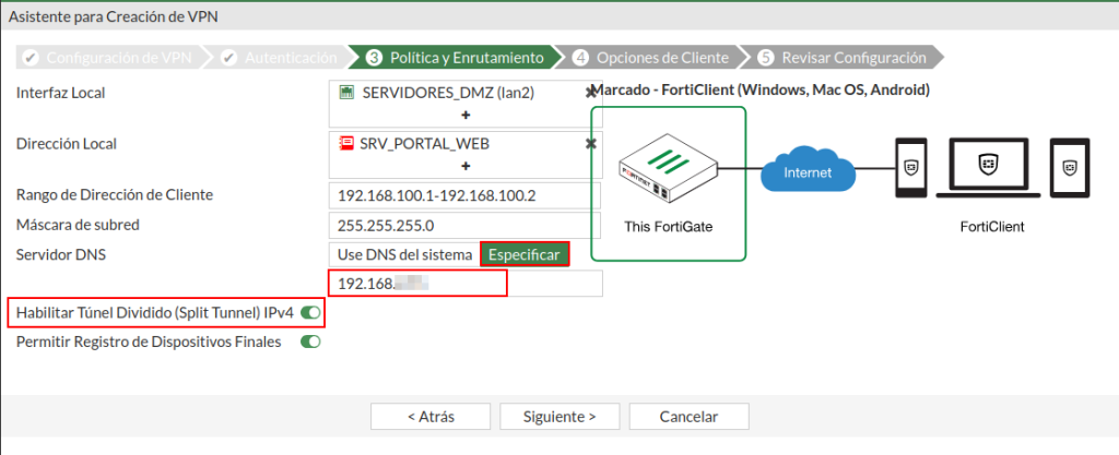 6. A continuación activa la opción Habilitar Túnel Dividido (Split Tunnel) si requieres enrutar solo el tráfico interno de la empresa (Acceso a Servidores, Base de datos, entre otros) a través del túnel VPN, mientras que el resto del tráfico (como la navegación por Internet) saldrá directamente a través de la conexión local del usuario, sin pasar por la VPN. Desactiva esta opción si requieres enrutar todo el tráfico a través del túnel VPN cifrado, que es la opción que ofrece mayor seguridad.
