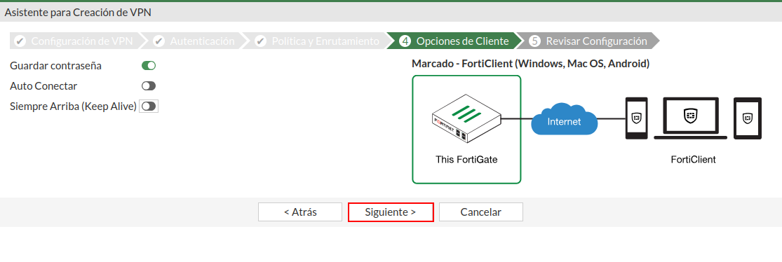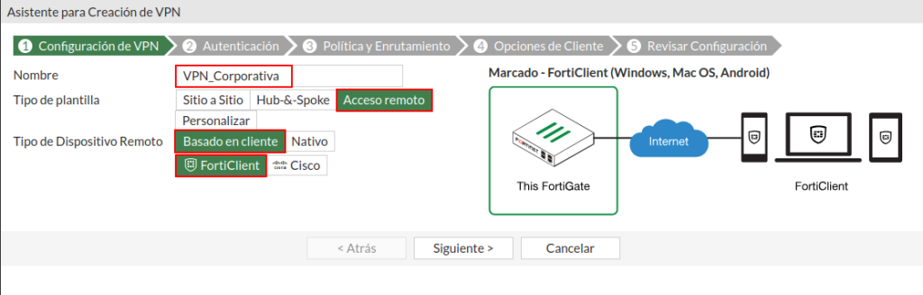 • Tipo de Dispositivo Remoto: Seleccionar las opciones Basado en Cliente y Forticlient: