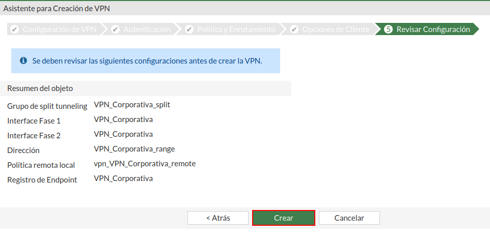 1. Se visualizará un resumen con los parámetros de configuración especificados anteriormente. Revisar dichos parámetros y presionar clic en el botón Crear para finalizar con la configuración de la VPN IPSEC.