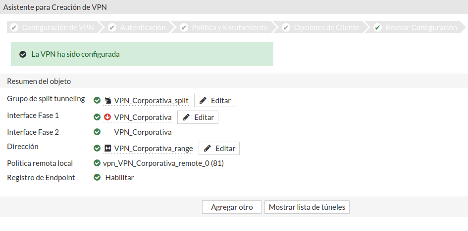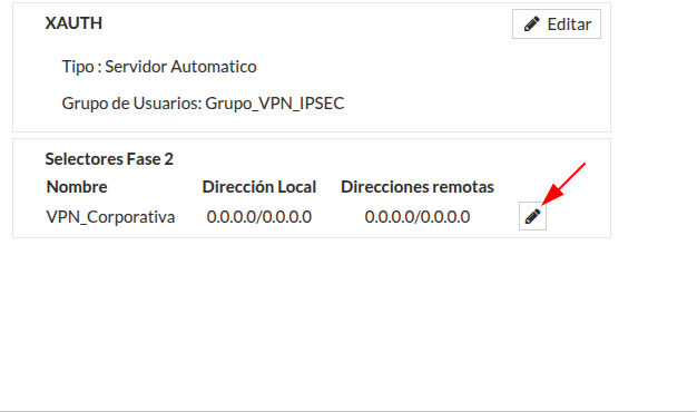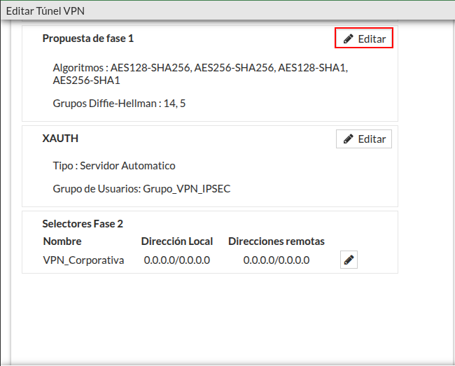 1. Al seleccionar la opción anterior se visualizará de forma detallada los parámetros de configuración establecidos para el túnel VPN creado anteriormente. Para adaptar la configuración del túnel VPN a las configuraciones habilitadas por defecto en la aplicación Forticlient realizaremos los siguientes cambios: