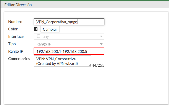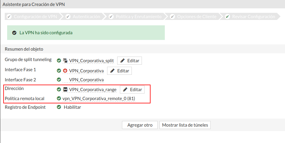 1. En la imagen anterior se puede apreciar que se creó automáticamente el objeto de dirección IP VPN_Corporativa_range que contiene el rango de direcciones IP especificadas en la configuración a demás de la política de Firewall con ID 81 denominada vpn_VPN_Corporativa_remote que permitirá el acceso de los usuarios que se conecten a través de la VPN IPSEC a la red de servidores de la empresa.