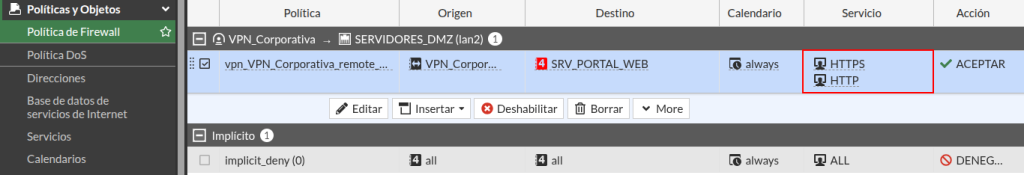 1. Si requieres modificar o personalizar la regla de Firewall, por ejemplo habilitado el acceso únicamente a los puertos 80 y 443 del servidor web, selecciona la opción Políticas y Objetos – Política de Firewall, busca la regla vpn_VPN_Corporativa_remote y edita esta política de acuerdo a tus necesidades.