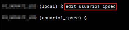 1. Ejecutar el comando edit seguido del nombre del usuario al cual se requiere habilitar el doble factor autenticación. Para este ejemplo se utilizará el usuario usuario1_ipsec. El comando a ejecutar es edit usuario1_ipsec