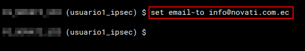 1. Especificar la cuenta de correo electrónico a la cual le llegará el código aleatorio. Para este ejemplo se utilizará la cuenta de correo electrónico info@novati.com.ec. El comando a ejecutar es set email-to info@novati.com.ec.