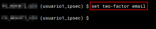 1. Habilita el doble factor de autenticación por correo electrónico para el usuario indicado anteriormente ejecutando para ello el siguiente comando: set two-factor email