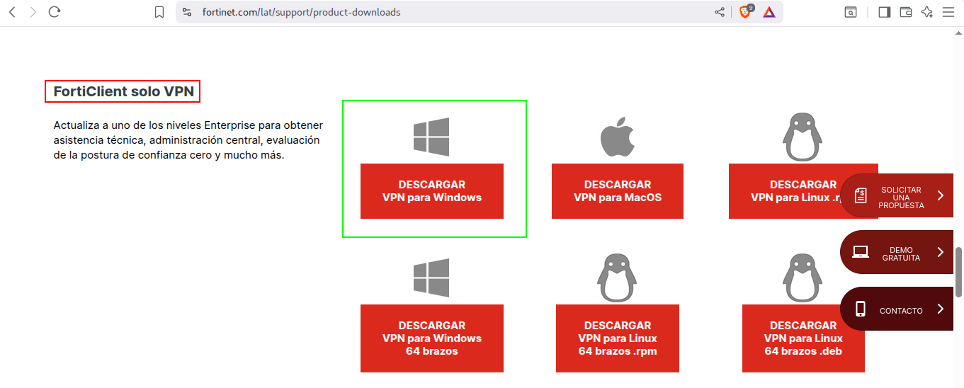 1. Descarga la aplicación Forticlient VPN para sistema operativo Windows del sitio oficial de Fortinet.