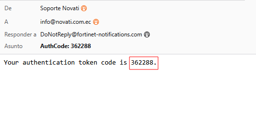 1. Como se encuentra habilitado el 2FA para el usuario usuario1_ipsec nos pedirá ingresar el código aleatorio de 6 dígitos enviado al correo electrónico registrado info@novati.com.ec.