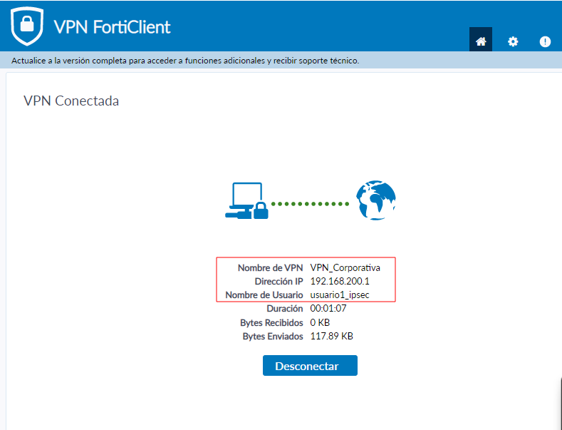 Para verificar la conexión y funcionamiento de la VPN IPSEC realizar los pasos detallados a continuación:
