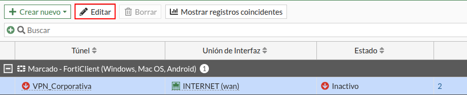 1. Presiona el botón Mostrar lista de túneles para visualizar el túnel VPN creado. Selecciona el mismo y presiona clic en el botón Editar.
