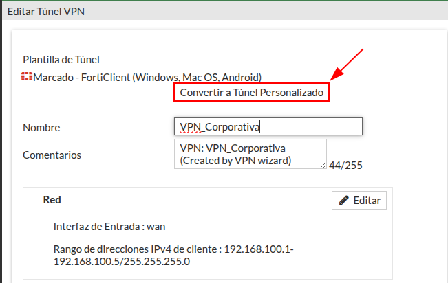 1. En la nueva interfaz mostrada presiona clic sobre la opción Convertir a Túnel Personalizado, lo que permitirá personalizar o modificar los parámetros de configuración del túnel VPN creado de acuerdo a nuestras necesidades.