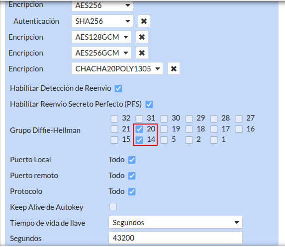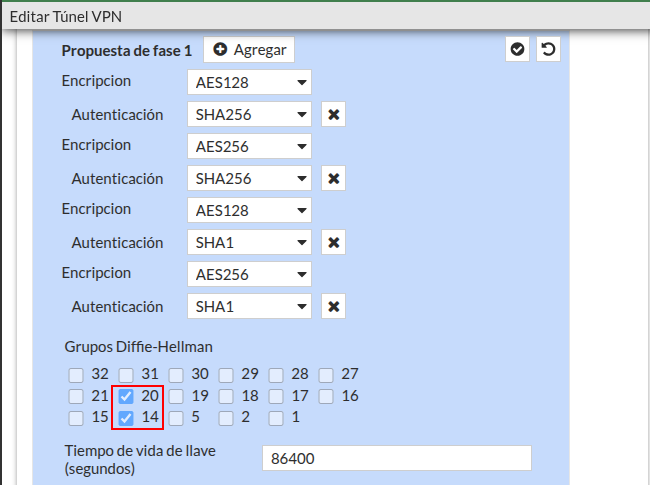 • En la sección de la Fase 1, desplazarse a la sección Grupos Diffie-Hellman y seleccionar el grupo 14 y 20 que ofrecen una mayor seguridad contra ataques ya que emplean un tamaño de bits de 2048 y 384 bits (curva elíptica) respectivamente. Para este caso es importante seleccionar el Grupo 20 ya que este grupo es el que viene habilitado por defecto en el cliente Forticlient instalado en sistemas operativos Windows.