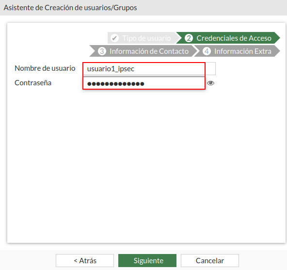 • A continuación ingresa las credenciales de acceso para el nuevo usuario, especificado un nombre de usuario y una contraseña con una longitud de al menos 12 caracteres que incluya letras mayúsculas, números y caracteres especiales. Para este ejemplo se creará el usuario usuario1_ipsec.