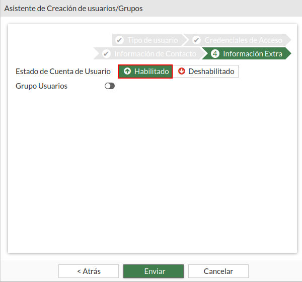 • Selecciona la opción Habilitado y presiona clic en el botón Enviar para finalizar con la creación del Usuario.