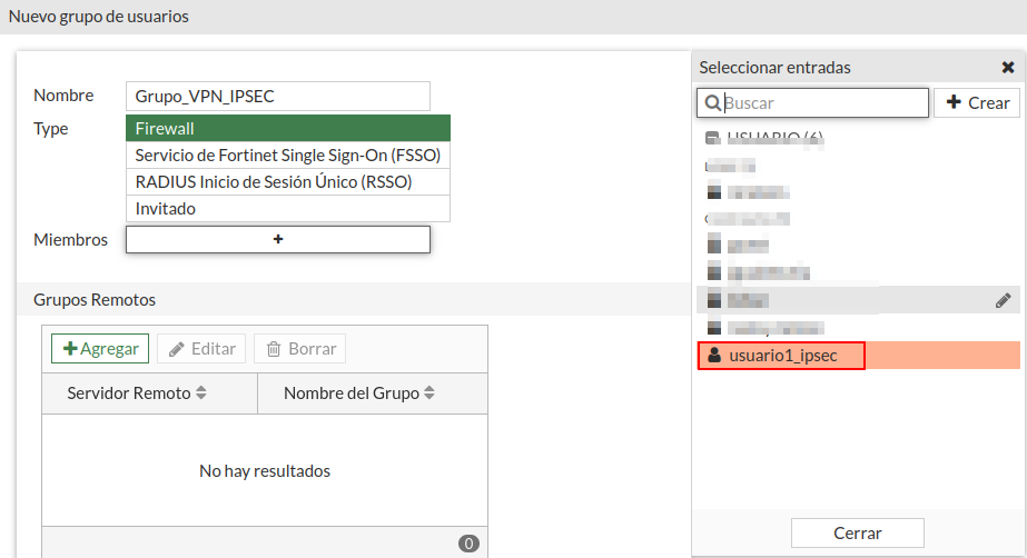 1. A continuación especificar el Grupo de Usuarios del cual forman parte él o los usuarios que se conectarán mediante la VPN IPSEC. Para este caso seleccionaremos el Grupo de Usuarios Grupo_VPN_IPSEC creado anteriormente.