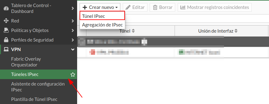 1. Selecciona la opción VPN – Tunules IPsec y presiona clic en el botón Crear Nuevo – Túnnel IPSEC.