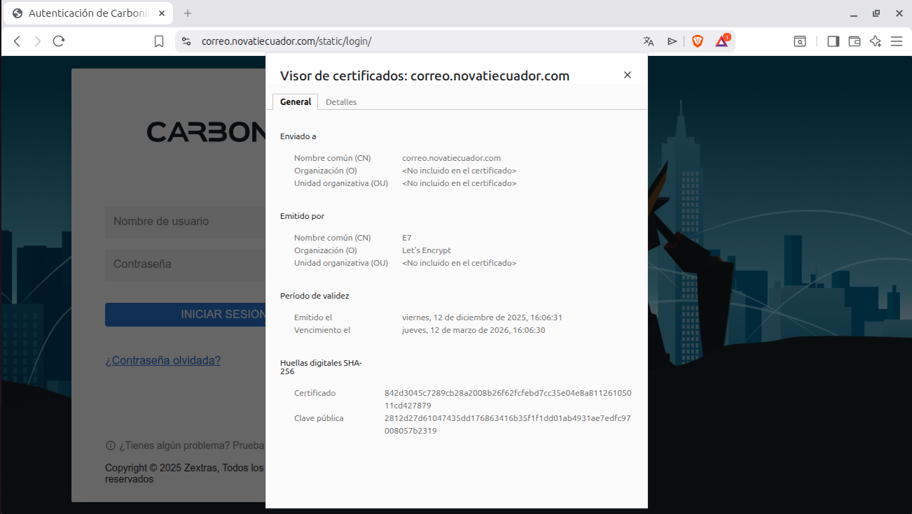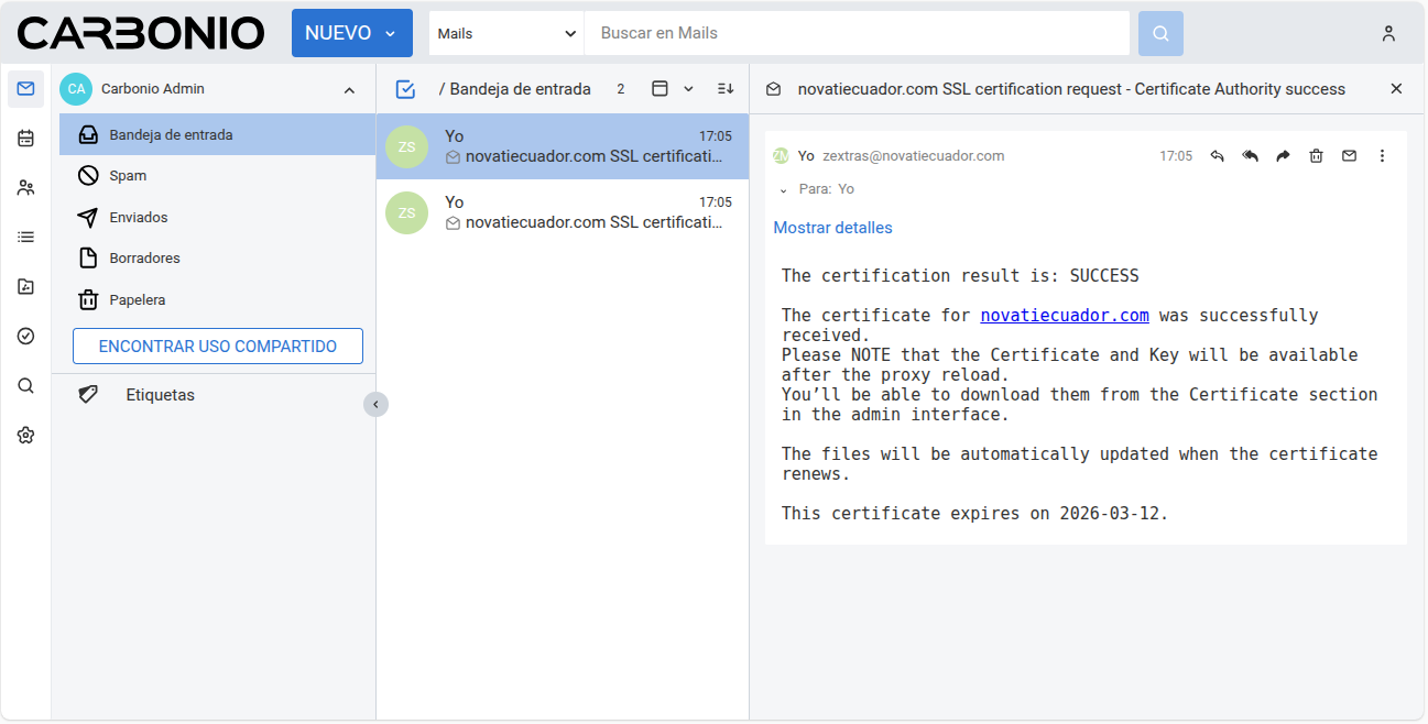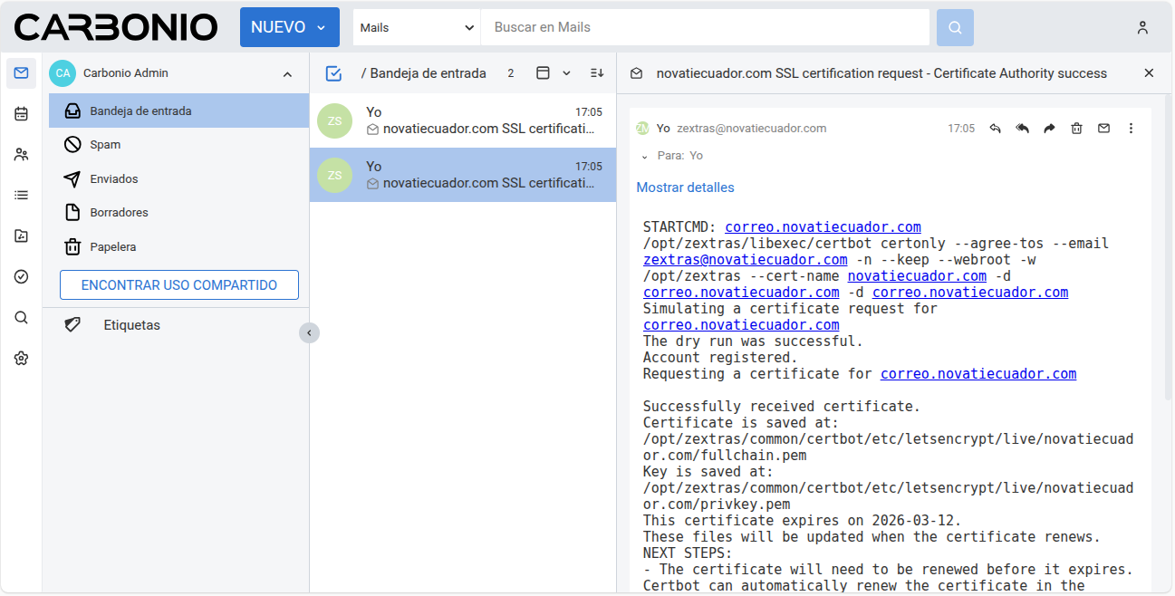Ingresa al buzón del usuario administrador zextras, y verifica en la bandeja de entrada que la solicitud del certificado haya sido exitosa, deberías ver dos correos electrónicos con un contenido similar al siguiente: