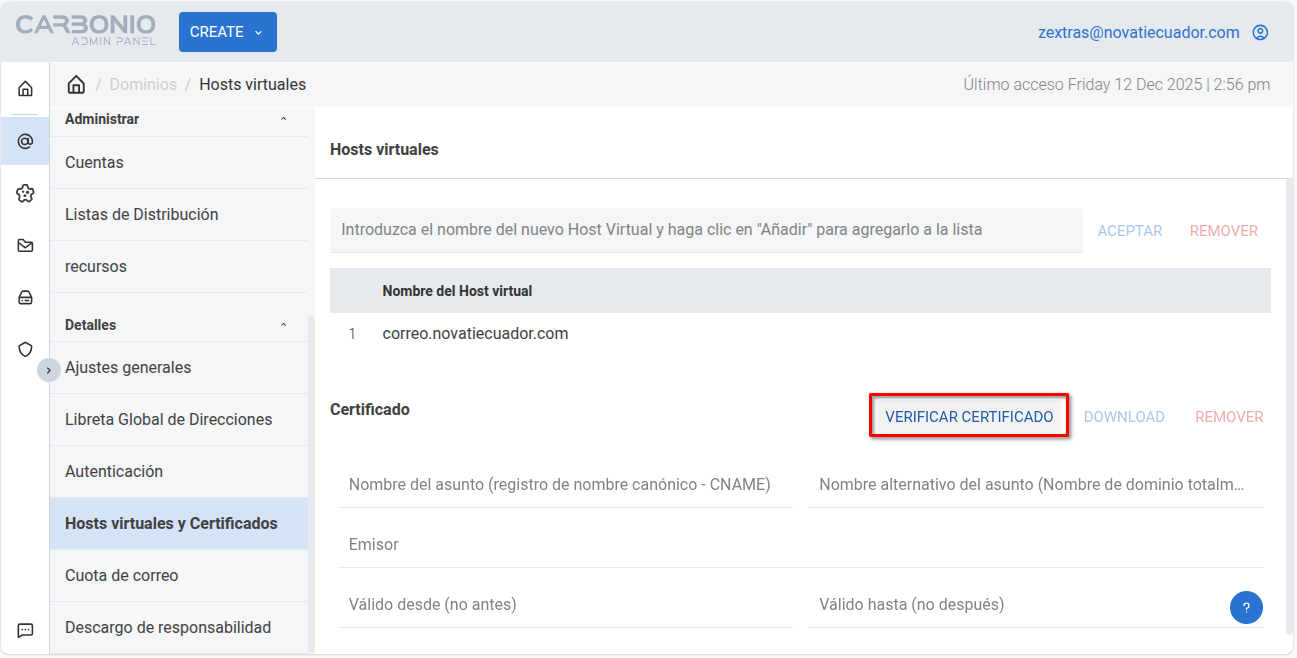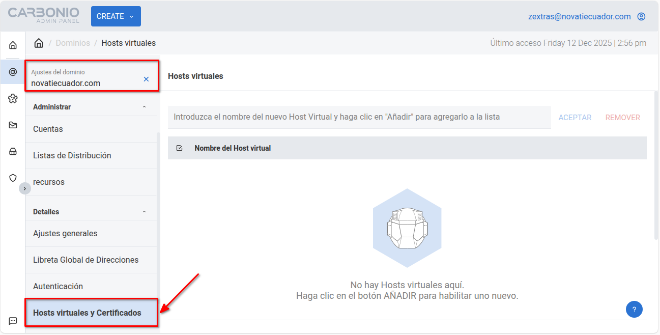 Ingresa a la interfaz web administrativa de tu servidor Carbonio. Selecciona tu dominio y en la sección de Detalles dirígete a la opción de Hosts Virtuales y certificados: