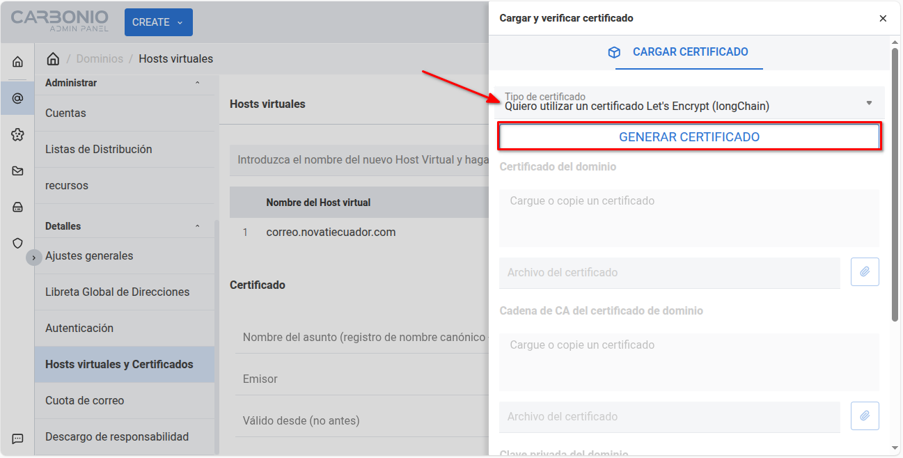 Selecciona el tipo de certificado Let’s Encrypt (longChain) y presiona clic en el botón Generar Certificado: